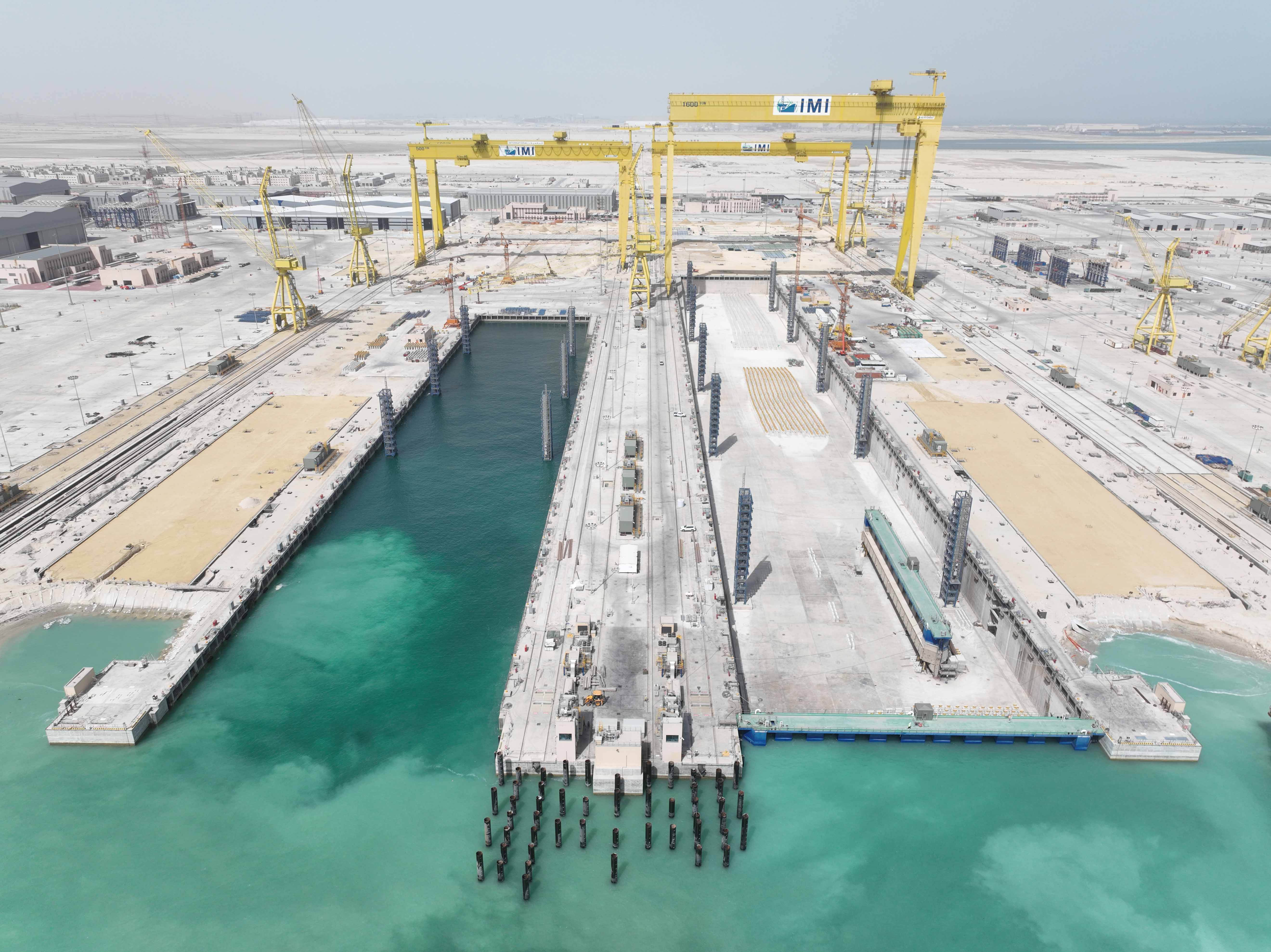 干船坞是整个船厂项目的核心工程,是各类船舶组装、下水、进坞维修的工作场所。4号干船坞,长550米,宽75米,深13.8米,共浇筑混凝土12.6万方,是中东最大干船坞,也是世界排名前列的几大干船坞之一。坞内最大可建造9万吨VLCC超级油轮,其550米的长度还可容纳两艘船同时建造。